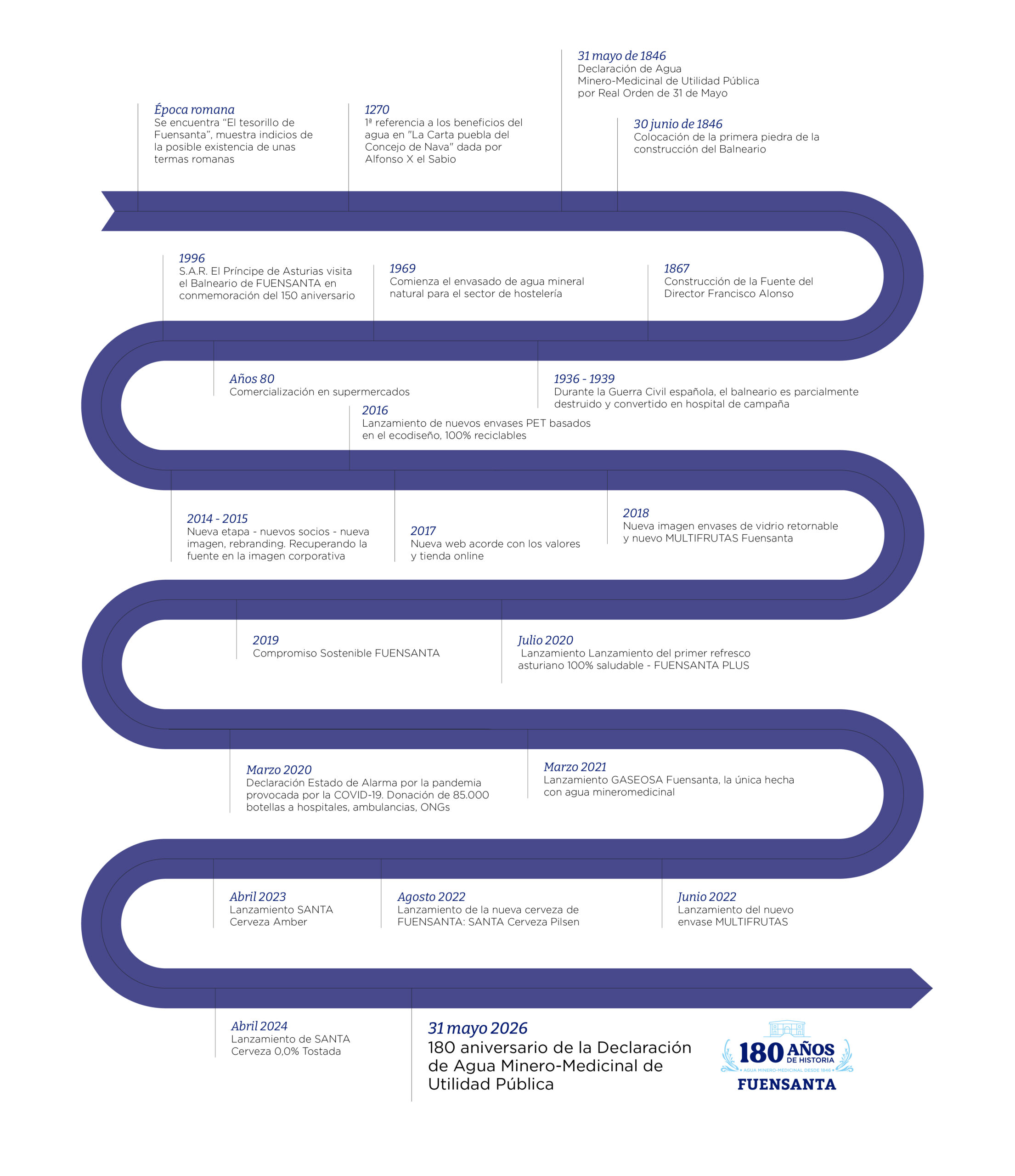 Hoy, 180 años después, nos reinventamos sin olvidar nuestras raíces y compromisos. Ampliamos su universo con nuevos productos elaborados con su agua minero-medicinal, refuerza su vínculo con Asturias y mantiene una apuesta firme por cuidar la naturaleza que le da vida.